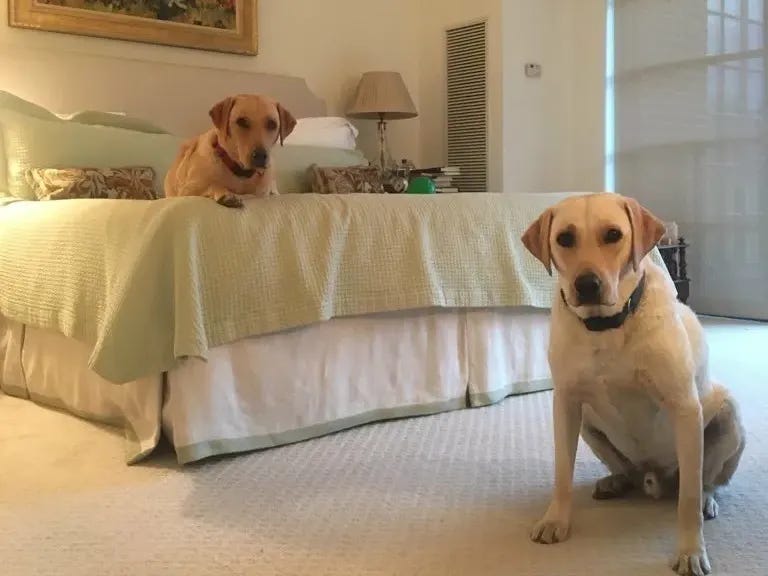Ann McLaughlin Korologos and her husband Tom were clients of my pet care business. Our team cared for who they loved — two yellow Labs named Sam and Winston.