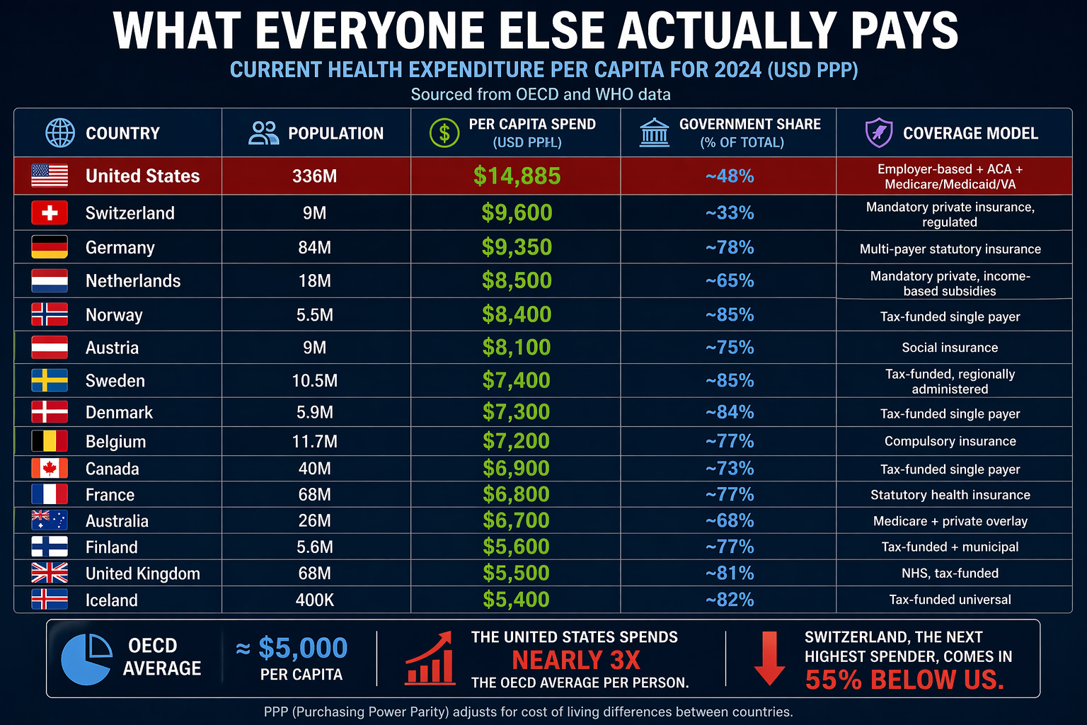 Every country on that list solved a problem we have not. They built a financing structure that aligns what you pay with what you receive. They did not build a better medical system than ours. They built a better payment system around their medical system.