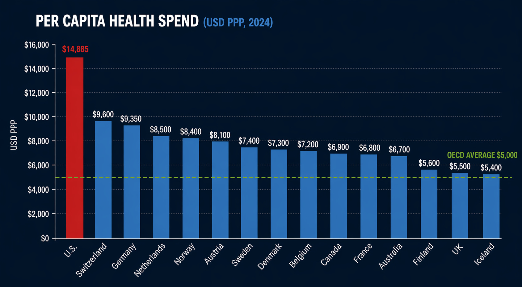 The OECD average is approximately $5,000 per capita. The United States spends nearly three times the OECD average per person. Switzerland, the next highest spender, comes in 55% below us.